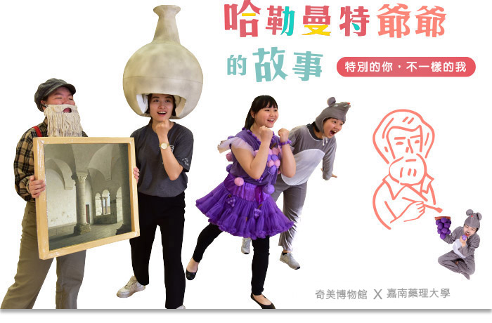 哈爺爺從小就熱愛畫畫和蒐集有趣的古物。有一天,哈爺爺在假日市集閒逛時,一件外觀陳舊的花瓶吸引了他的目光,最後決定買下它。哈爺爺看這花瓶愈看愈有趣,於是忍不住畫了起來,就在這個過程哈爺爺經歷了未曾有的體驗。之後,鎮上舉辦一場盛大的藝術季畫展,熱情的哈爺爺開心地報名參加,但創作的瓶頸一度讓他垂頭喪氣…想知道哈爺爺能否如期參加畫展嗎?竭誠歡迎您來奇美博物館觀賞荷蘭藝術家哈勒曼特特展之教育活動《哈勒曼特爺爺的故事─特別的你,不一樣的我》,與我們同樂吧!