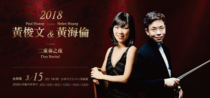 瑞士汐昂國際小提琴大賽首獎、2015艾弗瑞.費雪事業獎、及2017林肯表演藝術中心「新銳藝術家獎」得主— 來自台南的小提琴家黃俊文,與8歲開始職業生涯,13歲獲頒史上最年輕艾弗瑞.費雪職業獎得主,傳奇鋼琴家—黃海倫,兩位傑出華人音樂家,2018年三月首度返台合作,將以絕佳默契、高超技巧、淬煉獨到音樂品味,與台南觀眾分享極致音樂盛宴。