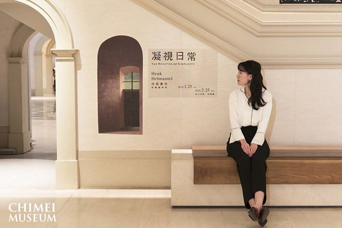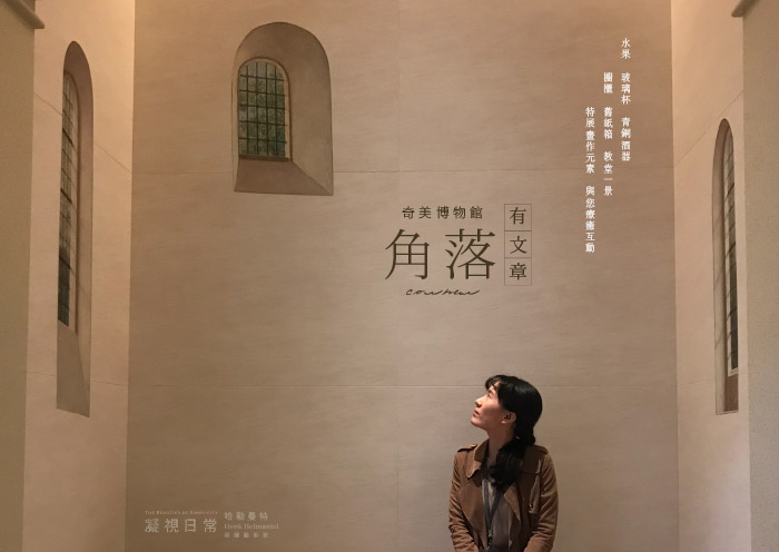 來逛奇美博物館,除了參觀展廳,也別錯過空間角落。搭配《凝視日常》特展,館內布置許多畫作壁貼,不但充滿藝術氣息,更富有互動及趣味性。而這些壁貼,全取自「當代寫實巨擘」哈勒曼特的畫作元素,例如洗手間的鏡面上,可以看到水果、玻璃杯、青銅酒器;大廳角落有櫥櫃、舊紙箱及靜謐窗景;搭電梯時,還會遇上教堂一隅。遊客與壁貼互動拍照,能藉位產生立體3D效果,如同自己伸手開櫥櫃、拿玻璃杯一般,相當有趣。