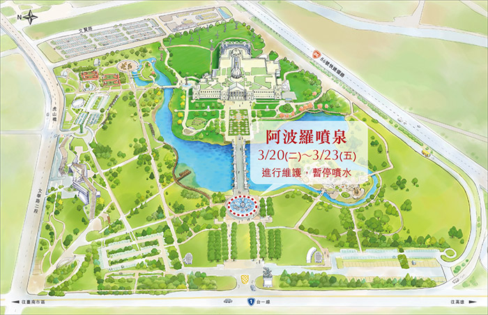 阿波羅噴泉進行維護作業,將於下述期間暫停運作,造成不便敬請見諒: 3/20(二)至3/24(六)進行清潔維護作業,暫停噴水。