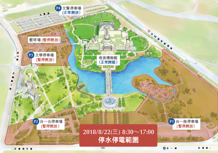 台南都會公園於2018年8月22日(星期三)8:30~17:00將進行高壓電路維修作業,部份區域停水停電,如造成遊園民眾不便,敬請見諒。