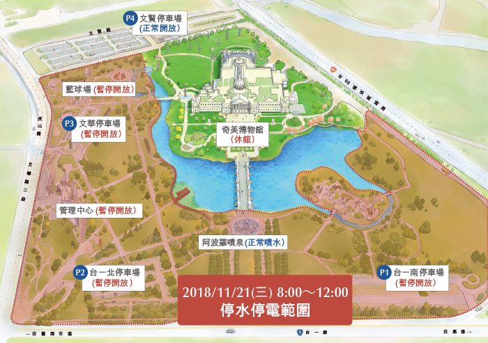 台南都會公園於2018年11月21日(星期三)8:00~12:00將進行電力系統設施作業,部份區域停水停電,如造成遊園民眾不便,敬請見諒。