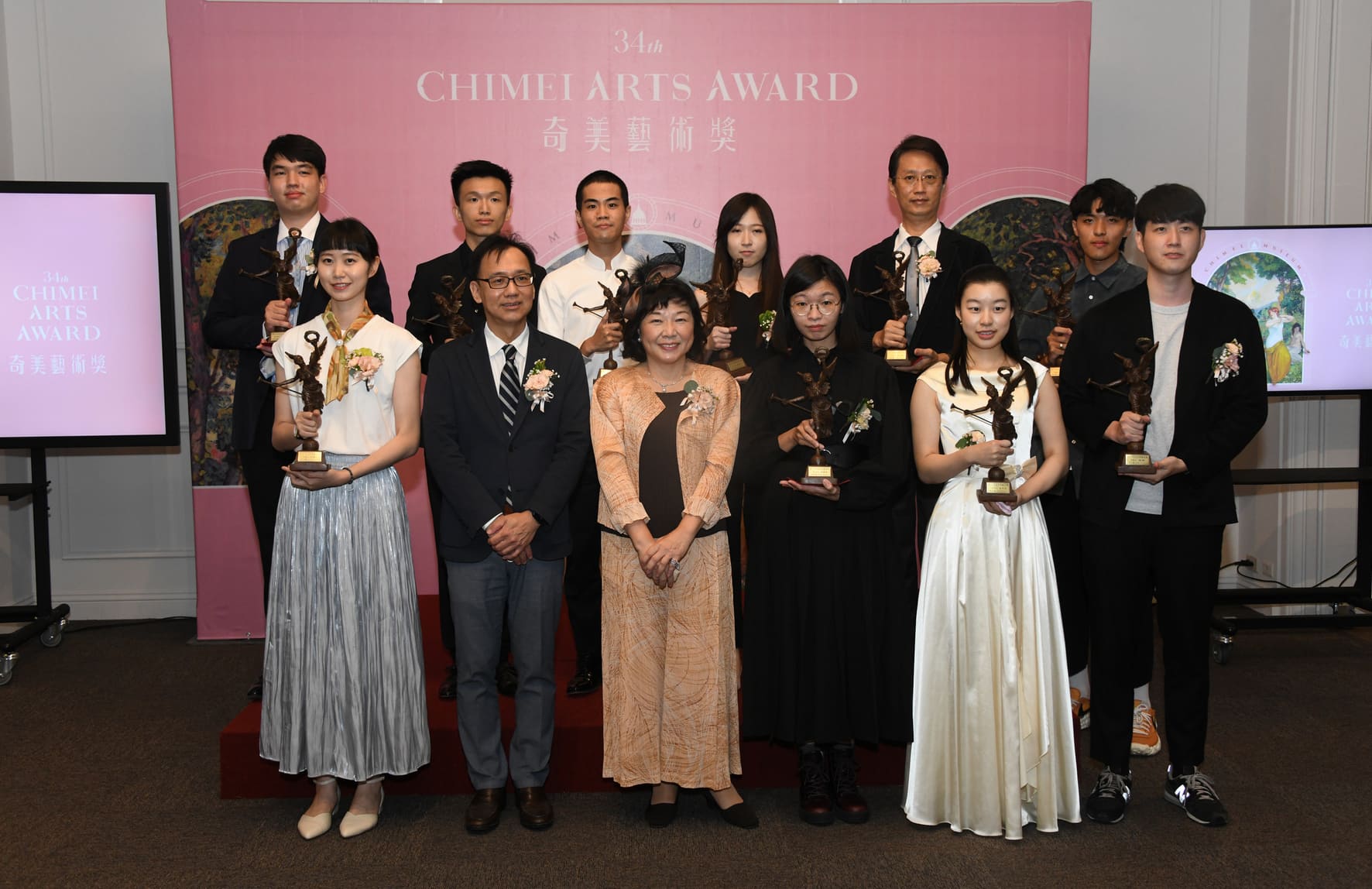第34屆奇美藝術獎頒獎典禮,奇美文化基金會執行長郭玲玲(前排左四)、奇美博物館館長許家彰(前排右四)、臺灣美術館前館長黃才郎(前排右三)、人間國寶木雕家陳啓村(前排右二)、國立臺南藝術大學校長詹景裕(前排左三)等貴賓與得獎者合影。
