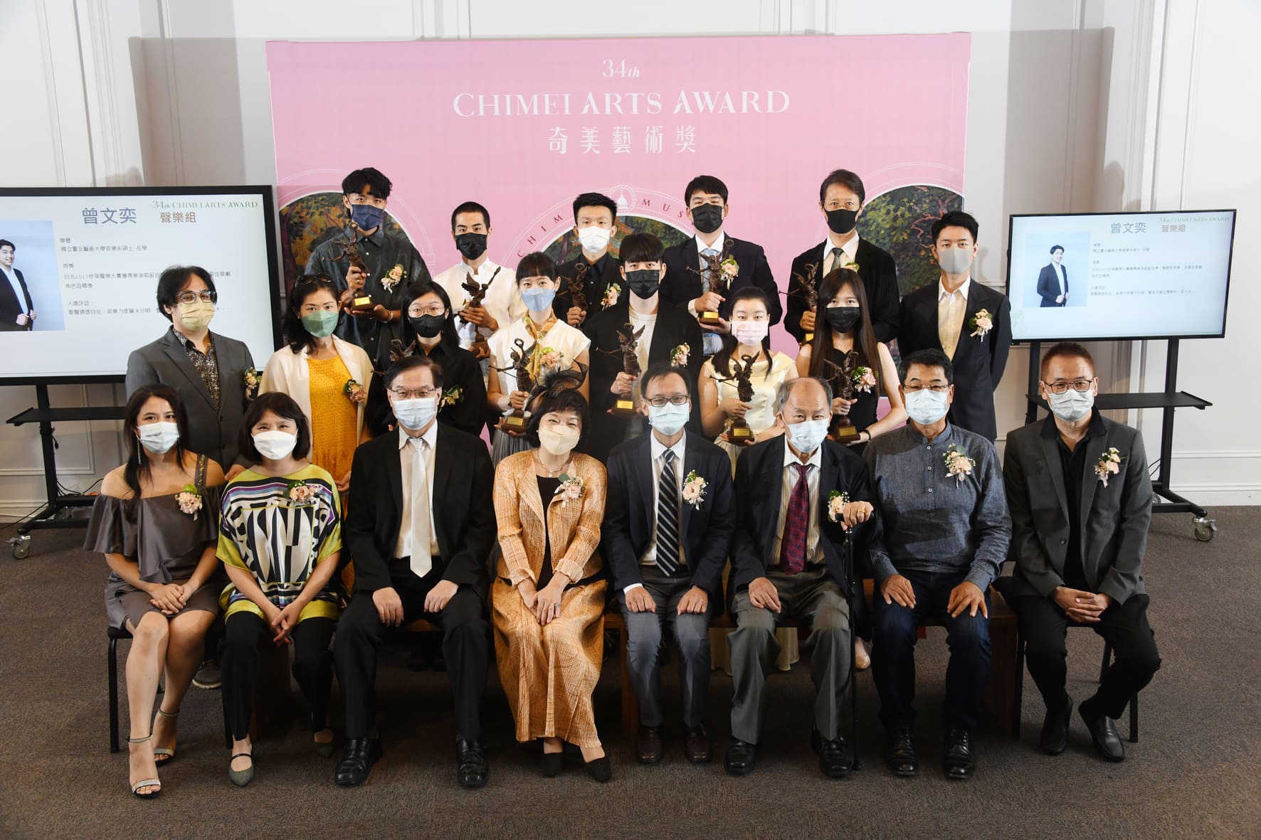 第34屆奇美藝術獎頒獎典禮,奇美文化基金會執行長郭玲玲(前排左三)、奇美博物館館長許家彰(前排左二)與得獎者合影。今日的頒獎典禮上,包括奇美文化基金會執行長郭玲玲、奇美博物館館長許家彰,擔任評審的文化部政務次長蕭宗煌、臺灣美術館前館長黃才郎、人間國寶木雕家陳啓村等,以及得獎者、貴賓等皆出席盛會。有別於去年因疫情關係只能舉辦線上典禮,今年大家又能齊聚一堂彼此敘舊,令人備感珍惜。