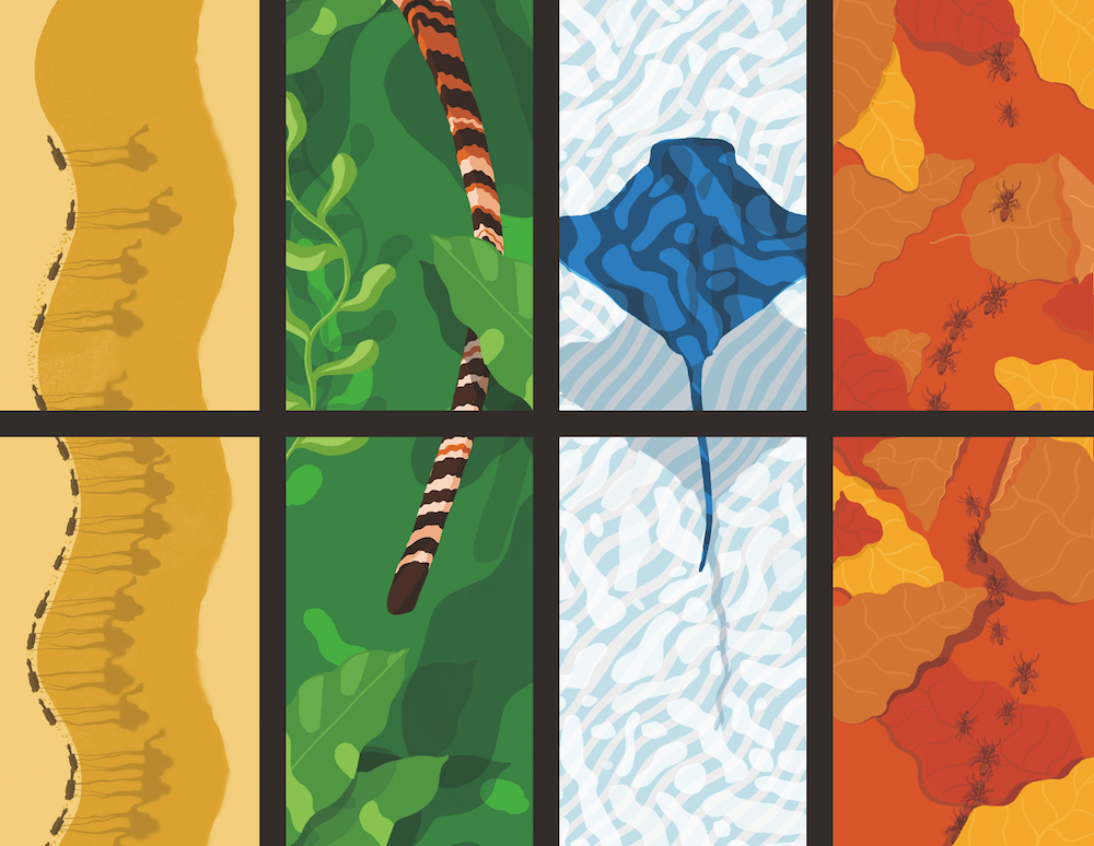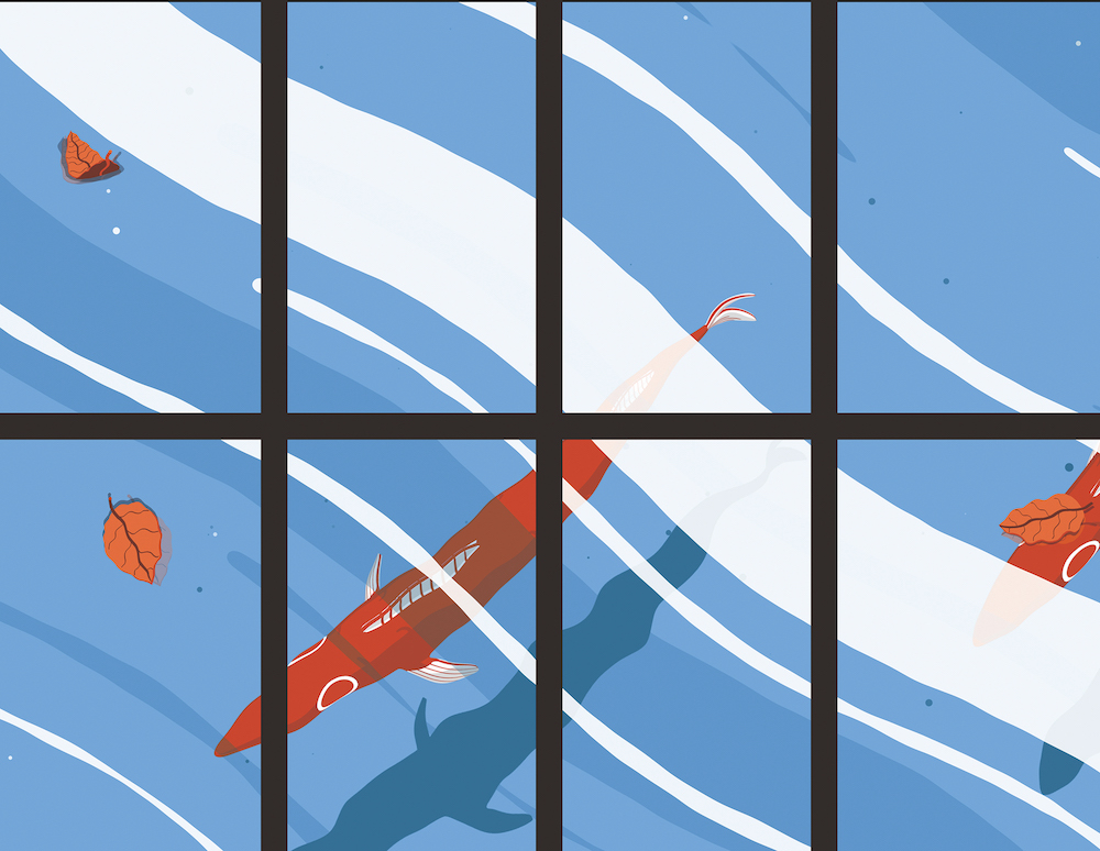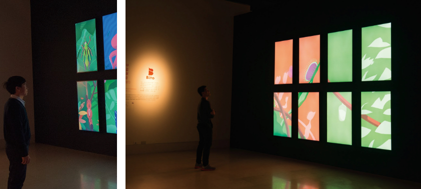 本次他以「Wild in Motion」一作參展,用八個螢幕展現八種觀看自然的視角,展示自然界動物多樣性之美。不論是八個螢幕合在一起或單獨分開看,都是可各自獨立存在的畫面。畫面上所有圖案、形狀、色塊和運動方式都來自蟲、魚、鳥、獸各種動物,看是各異的動物,卻可找出許多相似之處,創作者希望能以微觀的角度帶領觀者找出自然界美妙的設計感,比如對稱,對比,律動,協調等設計元素,開啟觀者觀看自然與動物的不同視角。