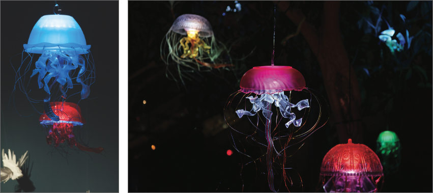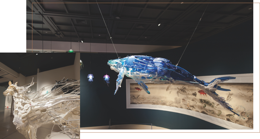 日本藝術家莎野加.甘茲(Sayaka GANZ)此次共有4件作品參展。她的創作材料很特殊,回收生活中的塑膠廢棄物,以色系分類,用裁切、黏貼的組合方式,將其轉換成移動中的動物樣貌。近距離觀察她的作品,會注意到一個個不同的塑膠製品,遠看所有物品卻自然融為一體。這些塑膠製品有彎曲、傷痕、褪色等使用過的痕跡,它們都來自舊貨店、垃圾箱或別人捐贈,將人類所製作的垃圾回收使用,創造出極具美感和動態的作品,出乎意料地表現,讓人讚嘆!