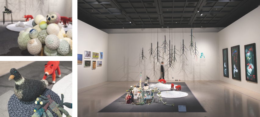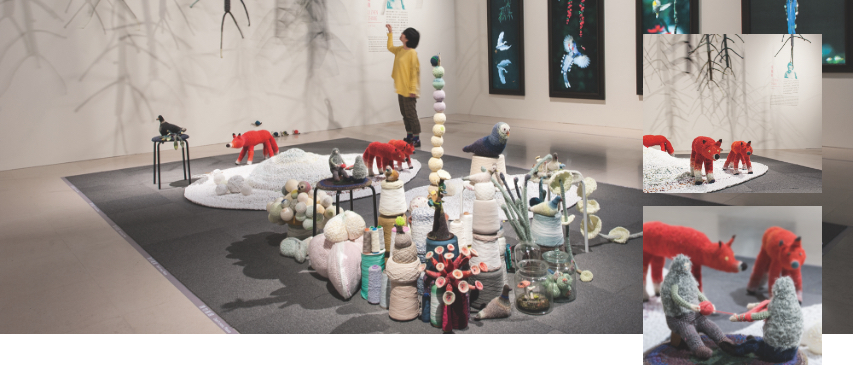 這次創作來自她幾年前的北海道之旅,某日清晨從窗戶望去,看見野生狐狸,在雪地上覓食,狐狸與她的目光對上,注視彼此許久,樹林裏的鳥群受狐狸驚嚇飛出林間,那一幕讓她印象深刻,十分難忘。這一幕總算透過張麗真一針針編織成型,狐狸出現在雪地上,牠虎視眈眈望著小鳥,準備獵食,四周佈滿各種植物,樹林裏還藏著其他動物,像極了童話故事書裡的場景,色彩豐富又充滿情境,有種溫暖的故事力量,讓人不由自主地想要親近。
