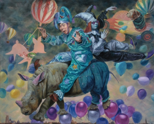 我的新樂園系列(嘻嘻哈哈)作品中運用誇大的肢體動作,傳達喜樂感,展現詼諧逗趣的一面,使觀者能慧心一笑並沉醉在我所安排的新樂園中。我將動物擬人化並將生活中接觸到的物件與城市作為表現題材,虛擬的空間,繽紛的色彩,浪漫的光線,無限的時空,採取古典寫實的手法,經過重新的安排與組合,形成一個乍似真實又魔幻的視覺世界,畫面中,立體中有平面,平面中亦有空間,將立體與平面交叉組合,使觀者身歷其境,悠遊於所創作出的畫面中,並以不同時空所創作出的另一空間,每種物件之間,似乎在訴說與對話著,而且,以寫實為手法,加強畫中的趣味性,創造一種似有若無的魔幻歡愉世界。