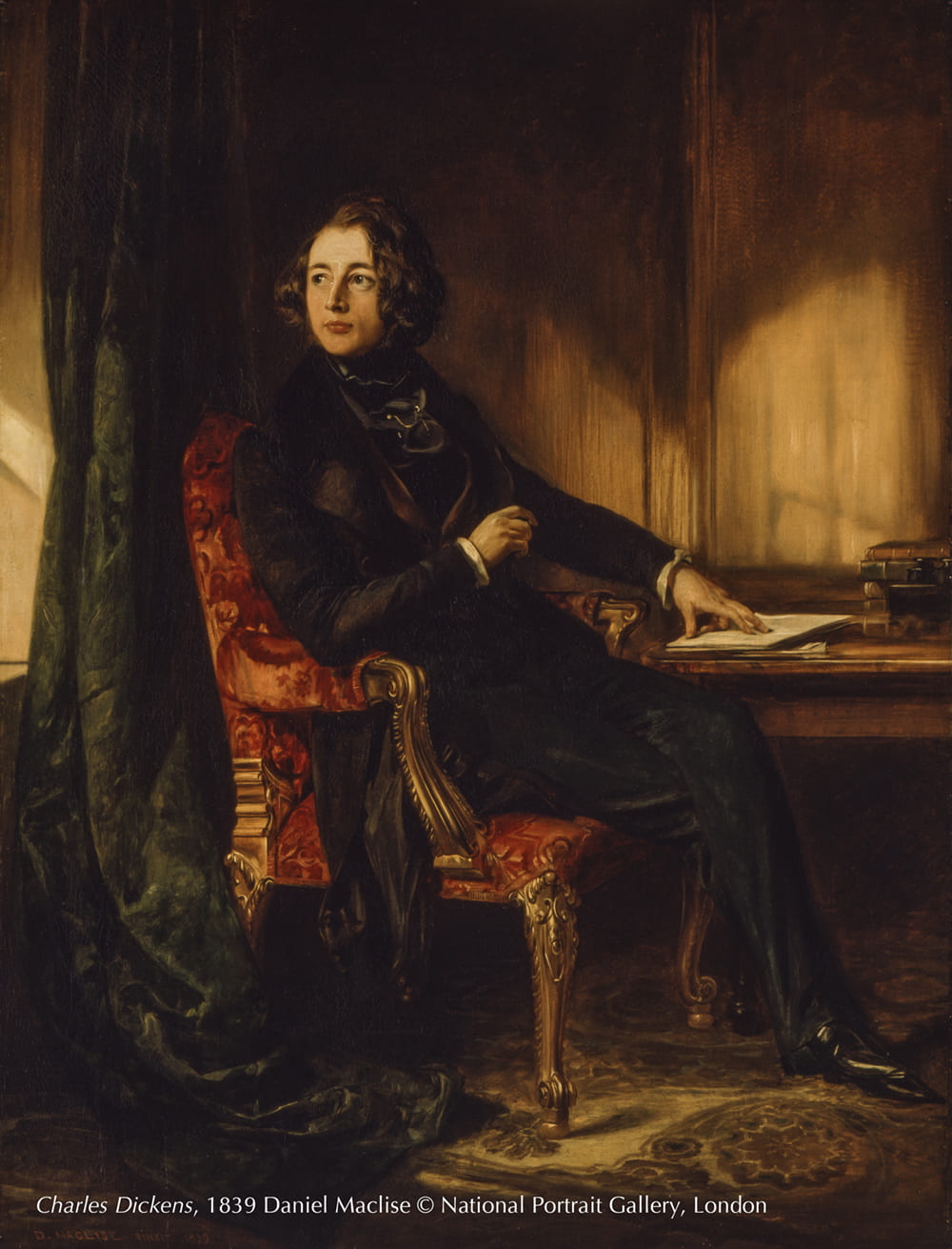 查爾斯.狄更斯是他的時代最偉大、最著名的小說家之一。他以作品《匹克威克外傳》(1836-7)建立起名聲,後來又陸續完成十五部小說,包含幾部英語名著,如《孤雛淚》(1837-9)、《小氣財神》(1843)以及《遠大前程》(1860-1)。在當時的小說家中,狄更斯十分與眾不同,因為他也是自身作品的優秀表演者,在英國與美國的巡迴演講都非常成功。 1838 年,狄更斯結識丹尼爾.麥克利斯並成為好友。在 1839 年 6 月 28 日的一封信中,狄更斯寫道:「麥克利斯竟然替我打造出另一張臉,大家都意想不到。」為了塑造形象,狄更斯化身為文人貴公子,穿著嶄新黑色寬領禮服與背心、維持靴上線條不起皺的踩腳長褲,並繫上黑緞鑲鑽的領巾。這幅肖像的版畫也用在狄更斯第三部小說《尼古拉斯.尼克貝》(1839)第一版的封面上。
