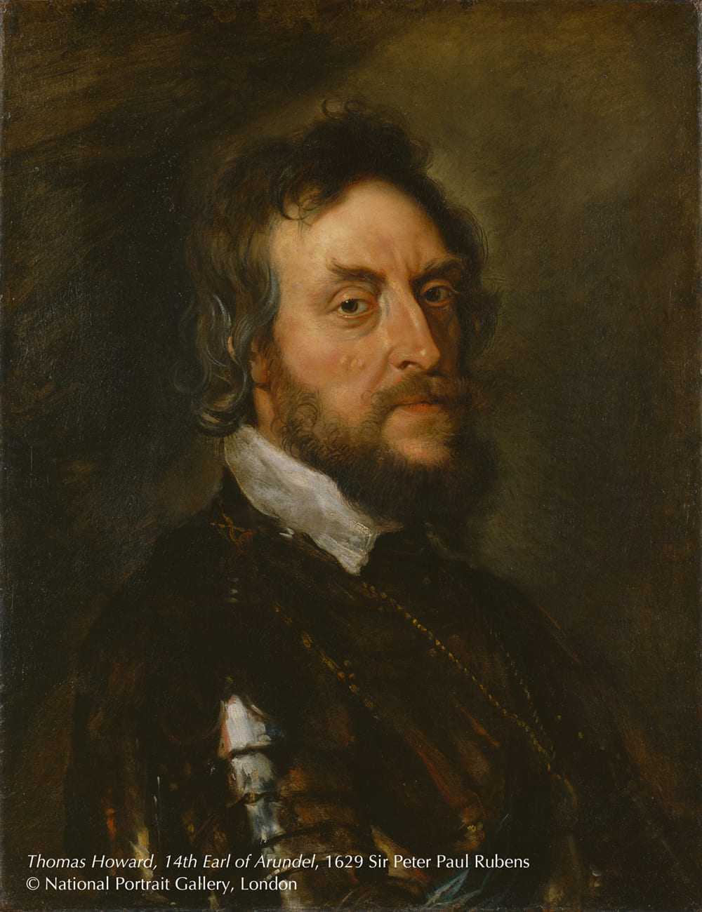 在國王詹姆斯一世恢復阿倫戴爾爵位榮銜後,湯馬斯.霍華德成為國王查理一世最信任的大臣之一,對英國藝術發展也有重大影響;他擁有倫敦第一批重要的古典文物收藏,受到法蘭德斯的畫家彼得.保羅.魯本斯的推崇。 魯本斯於 1629 年到倫敦進行外交任務期間繪製了這幅肖像。畫面中霍華德戴上嘉德勳章綬帶,穿著閃閃發光的盔甲,與元帥伯爵的地位十分相稱。魯本斯所展現的生動技法,震撼了英國的藝術贊助者,他在倫敦的旋風式訪問,也為自己最有才華的弟子安東尼.范.戴克打下了良好基礎。范.戴克於日後獲得國王查理一世青睞, 1632 年受封為宮廷畫師。