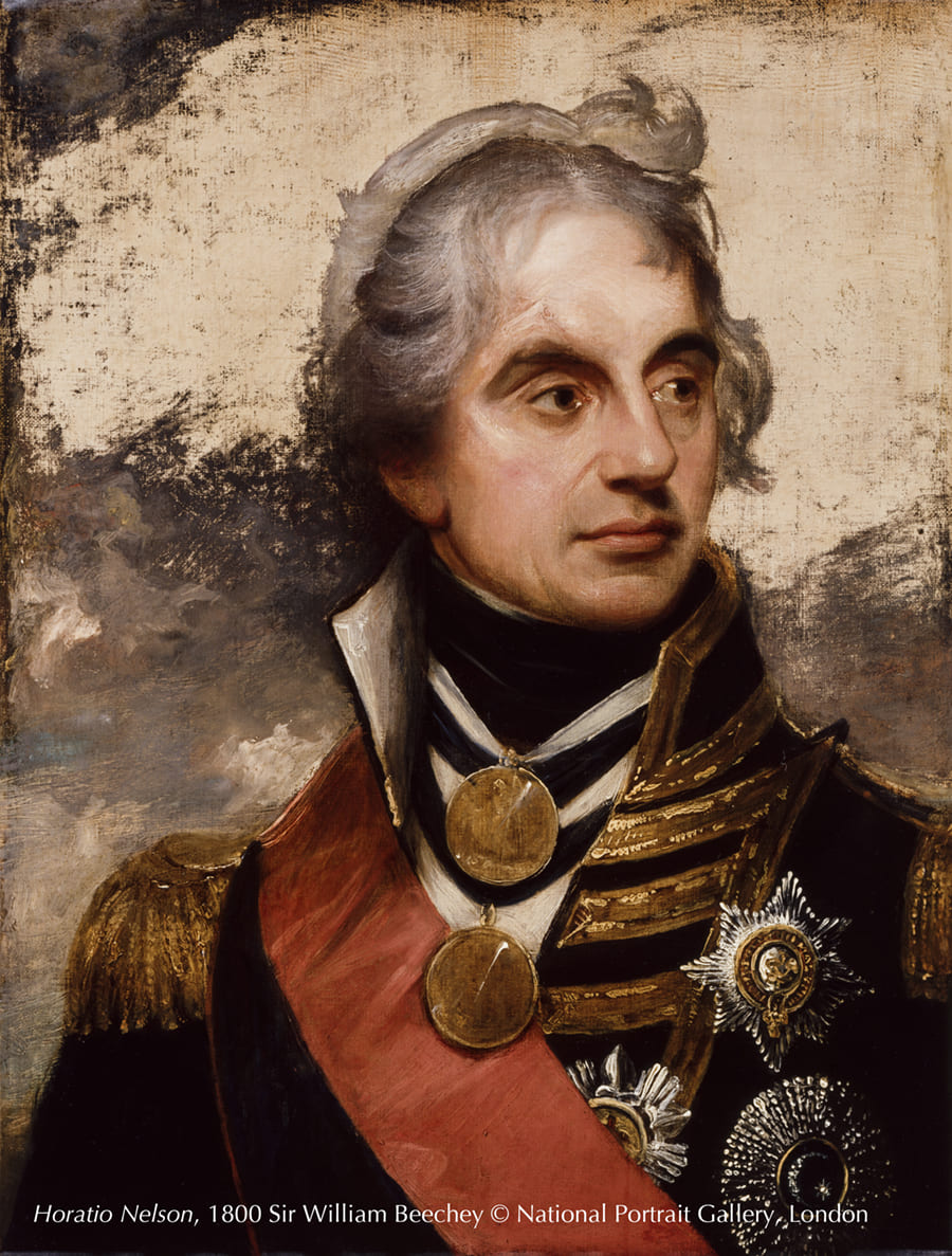 富有魅力、自信且自負的海軍名將納爾遜,一直很注意自己的公眾形象。1793 年英法爆發戰事,他在科西嘉島一波成功的進攻中不幸失去一隻眼睛,又在 1797 年一場戰役裡失去了右手臂。後來他在1805年特拉法加海戰中摧毀拿破崙的海軍武力,卻也為國捐軀。如今他的紀念柱矗立在倫敦特拉法加廣場最顯耀的位置。 威廉.比奇這張生動的草圖是一幅納爾遜全身肖像的習作,肖像畫由納爾遜出生地諾福克郡諾里奇市委託製作。畫家對頭部形狀的修改十分明顯,不過這張草圖仍公認是與納爾遜將軍最為神似的作品。像比奇畫的這種肖像畫,有助於鞏固納爾遜瀟灑浪漫的英雄名聲。