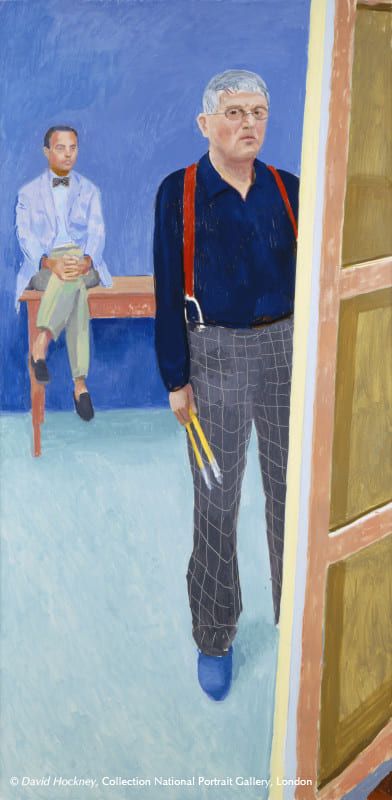 大衛.霍克尼是英國最著名的當代藝術家之一,作品類型涵括素描、繪畫、版畫與數位科技。自畫像是霍克尼作品版圖裡一個不可或缺的主軸。2005 年霍克尼在他名為「好萊塢山丘」的工作室裡,創作一系列約真人大小的繪畫作品,這張自畫像是其中之一。這些作品都是在少數幾次現場真人寫生後完成。霍克尼直接將油彩塗在畫布上,完全沒有參考照片或預畫做準備。這幅肖像畫中,霍克尼探索自己對鏡子的迷戀,主題則環繞著藝術家與模特兒。作品在觀眾、畫中的霍克尼與坐著的人物之間,建立起三角形的視線交流。坐著的人是他的朋友,也是前工作室經理查爾斯.戴爾.薛普斯 。